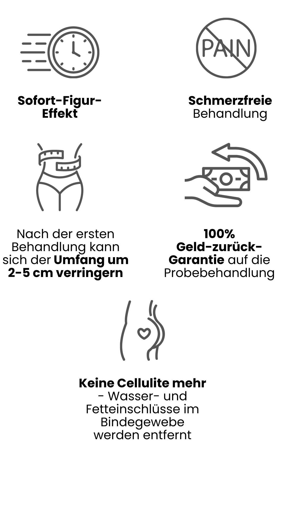 Unsere einzigartige Methode führt dich in kurzer Zeit zu deinem Traum-Body. Ohne Anstrengung, ohne hohen Zeitaufwand. Hinlegen, Elektroden werden befestigt, entspannen. Bereits nach der ersten Behandlung verlierst du 2-5 cm deines Körperumfangs. Du glaubst uns nicht? Kein Problem! Sollte dieses Ergebnis nicht eintreffen, erhältst du dank der 100%-Geld-Zurück-Garantie den vollen Preis der Probebehandlung zurück erstattet. Somit besteht für dich absolut kein Risiko.