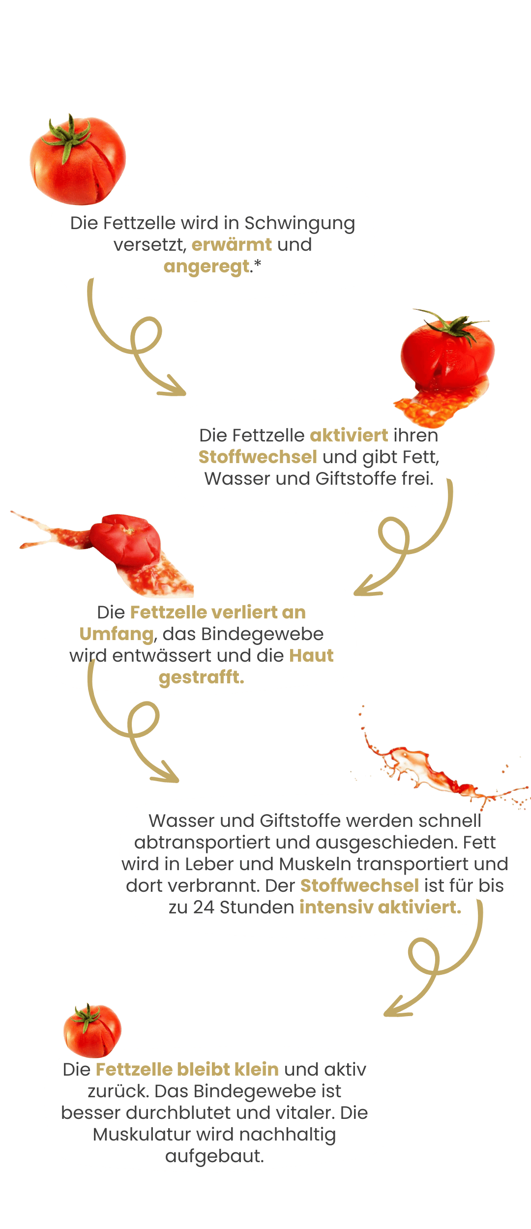 *Warnung! Die Fettzelle wird weder beschädigt noch zerstört. Vielmehr wird lediglich der Stoffwechsel der Fettzelle aktiviert, um den natürlichen Fettabbau wieder in Gang zu setzen. Die Fettzelle wird kurz porös und geht danach wieder zu. Die Abbildung der Fettzelle dient allein der veranschaulichenden Darstellung. Eine Reduzierung des Körpergewichts auf der Waage erfordert eine entsprechend angepasste Ernährung.